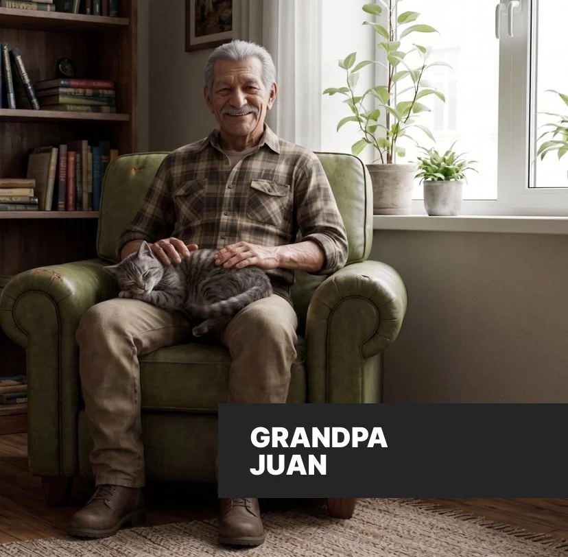 Meet Grandpa Juan. He is happily retired. He loves spending time with his family and going fishing.